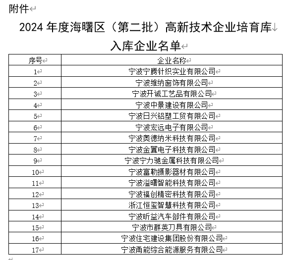 附件:2024年度海曙區(qū)(第二批)國(guó)家高新技術(shù)企業(yè)培育庫(kù)入庫(kù)企業(yè)名單